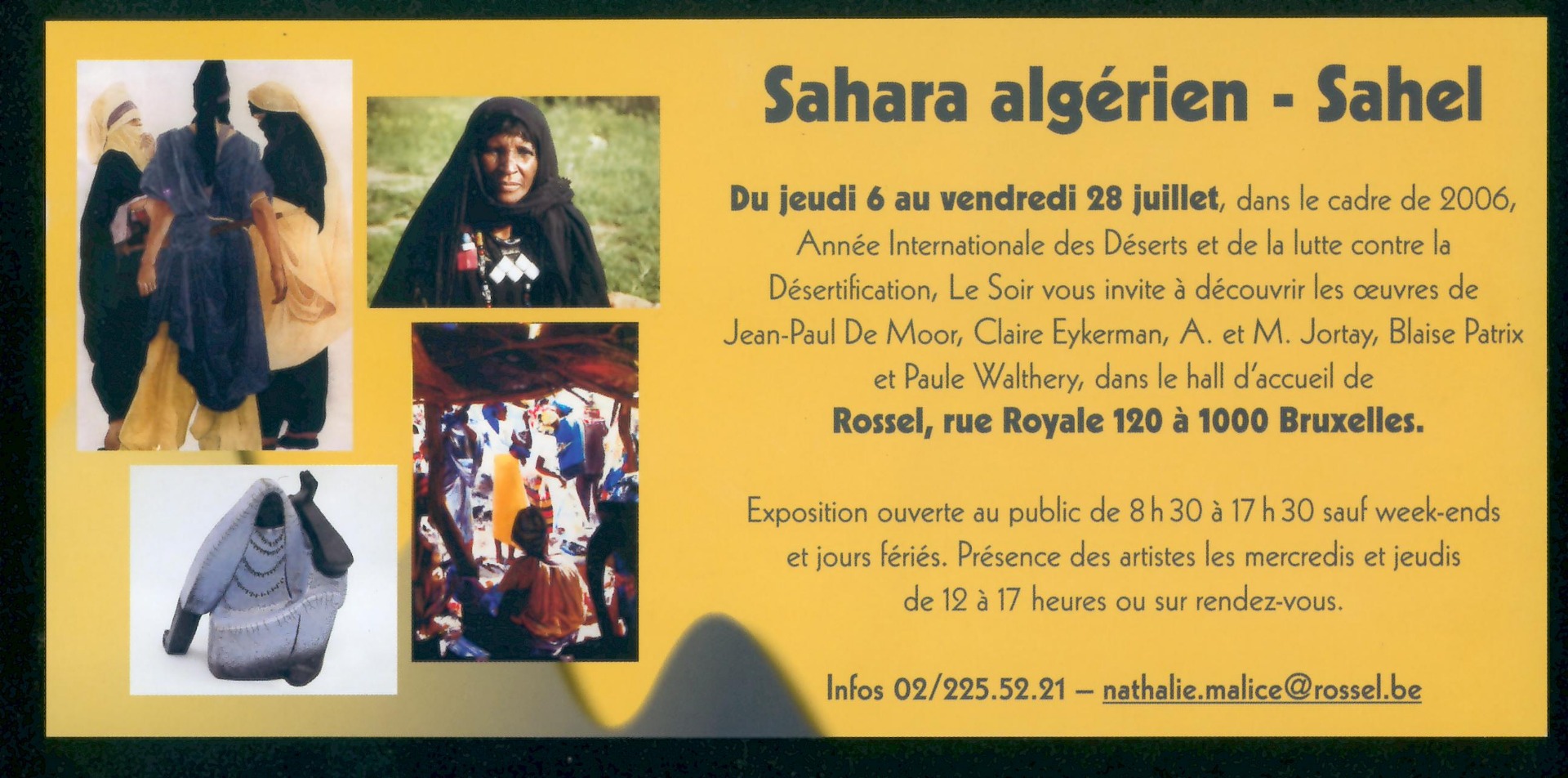 A l'occasion de l'année Internationale des Déserts et de la lutte contre la désertification, l'agence Rossel a invité quelques artistes à présenter leurs oeuvres. Parmi eux, Jean-Paul De MOOR, Claire EYKERMAN, A & M JORTAY, Blaise PATRIX et Paule WALTHERY
